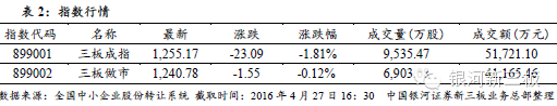 指数方面,三板做市指数低开低走,盘中维持弱势震荡走势,临近尾盘跌幅有小幅收窄但未见翻红。截至收盘,三板做市指数报1,240.78点,跌1.55点,跌幅0.12%,成交额4.12亿元。成指收报1,255.17点,跌23.09点,跌幅1.81%,成交5.17亿元。
