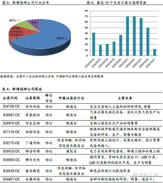 4月27日,共有12家公司挂牌新三板,涉足4个行业分别为制造业、信息传输、软件和信息技术服务业、建筑业和教育,当日挂牌公司依旧以制造业为主,挂牌8家公司,市场总挂牌数达6,935家,协议转让企业5,461家,做市转让企业1,474家。