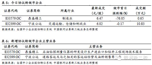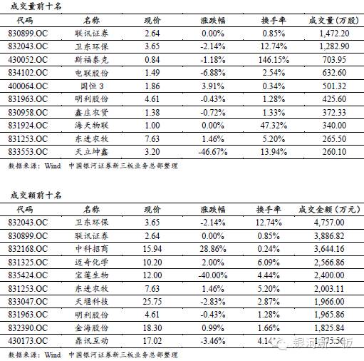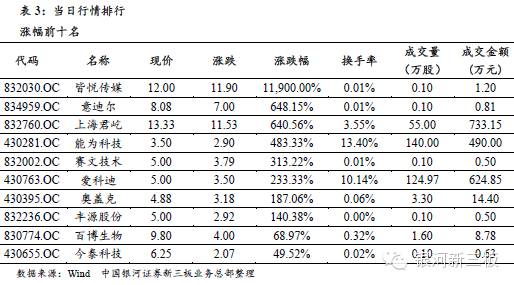 个股方面:当日三板市场中共有1,084只个股发生交易。其中,卫东环保、联讯证券和中科招商的成交额居前,分别为4,757万元、3,886.82万元和3,644.16万元;同时还有迈奇化学、宝莲生物和东进农牧的成交额超过2,000万元。此外,包括天堰科技、名利仓储在内的8只个股成交额超过千万元。涨跌幅来看,当日新三板市场中共有449只个股实现上涨,有460只个股下跌。其中,皆悦传媒的股价涨幅最高,达到119倍,收于12元;意迪尔、上海君屹、能为科技、赛文技术和爱科迪的涨幅居前,分别上涨6.48倍、6.41倍、4.83倍、3.13倍和2.33倍;奥盖克和丰源股份的涨幅也均超过1倍。相对而言,雪银矿、亚茂光电的跌幅超过80%。