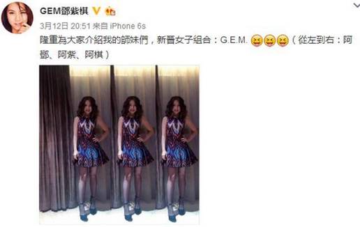 2日晚上,邓紫棋在网上晒出一张自己的全身照,配文称:“隆重为大家介绍我的师妹们,新晋女子组合:G.E.M. (从左到右:阿邓、阿紫、阿棋)。”