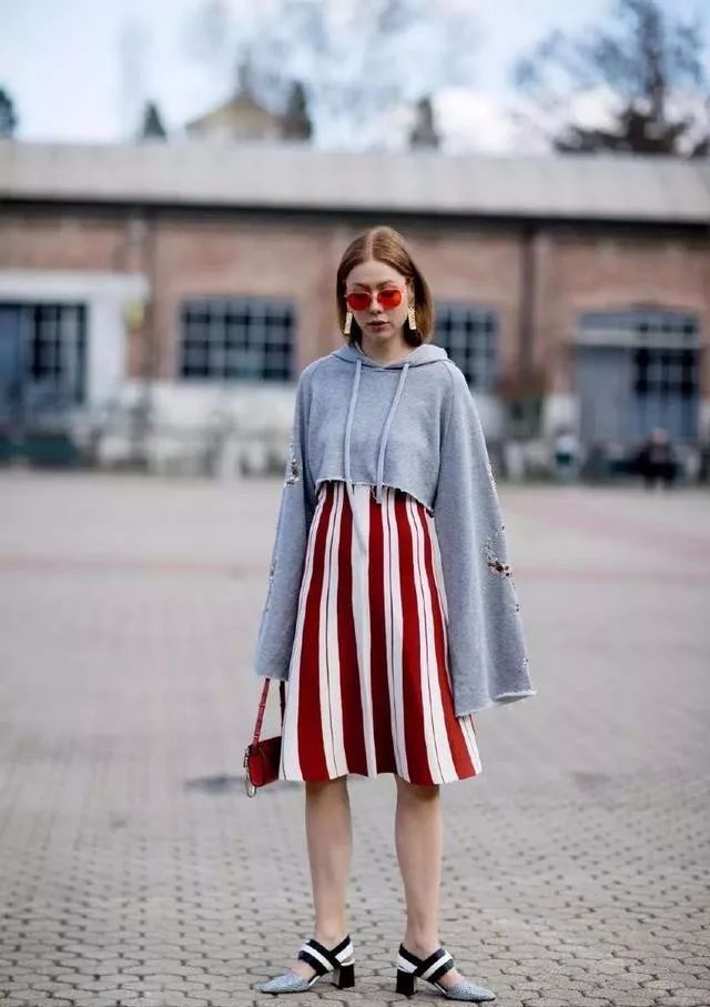 第三是,最好选择裙摆不要太宽的,介乎于直筒和A字型之间的版型,竖条纹的设计加上Crop top搭配,显高显瘦效果更是加倍。