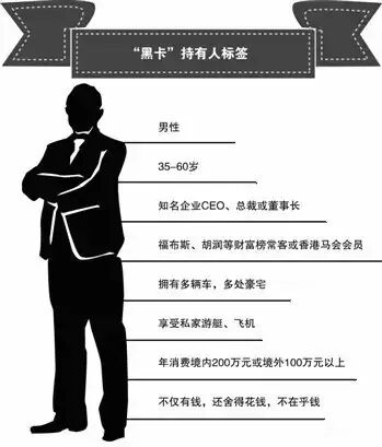 根据一位记者的总结,目前国内黑卡持有人一般具有以下标签:#男性#,#知名企业CEO、总裁或董事长#,#35岁~60岁#,#拥有多辆轿车、多处豪宅#,#享受私家游艇、飞机#。