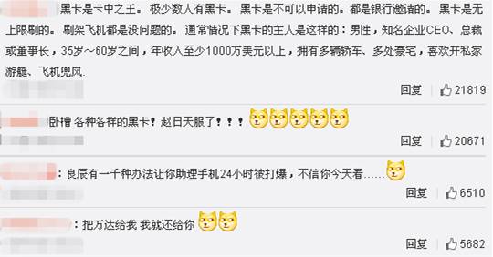 除了上面说明书一般干巴巴的福利,人民群众更加喜闻乐见的是故事会一般真实性成迷的黑卡使用传说~黑卡还被称为“阿拉丁神灯”,任性要求全能满足。