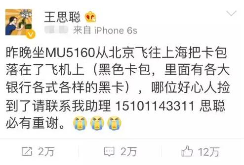 思聪老爹王健林刚坐会首富宝座,思聪就在坐飞机的时候把卡包丢了。十万火急的思聪跑到微博上发了寻物启事求助,颇有些病急乱投医的意味,连助理电话都暴露了。