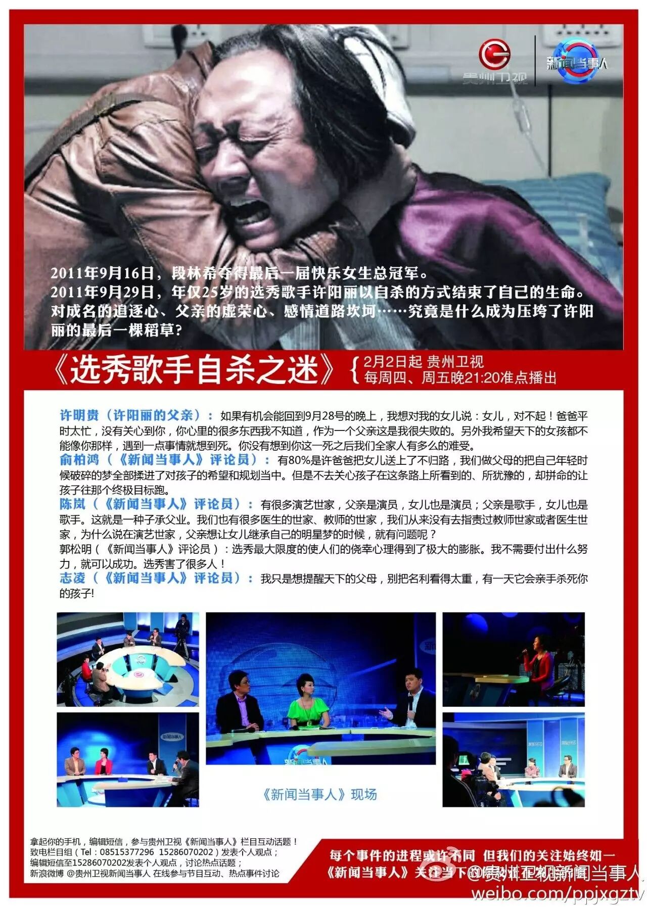 然而这确是实实在在的乌龙。缘起贵州卫视之前做的一档节目《新闻当事人》里,做了一期关于选秀歌手自杀的专题。