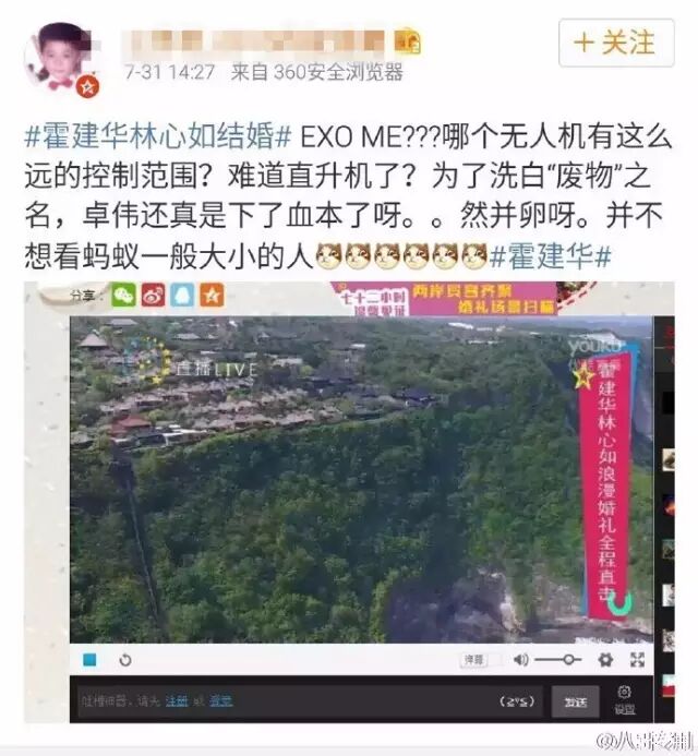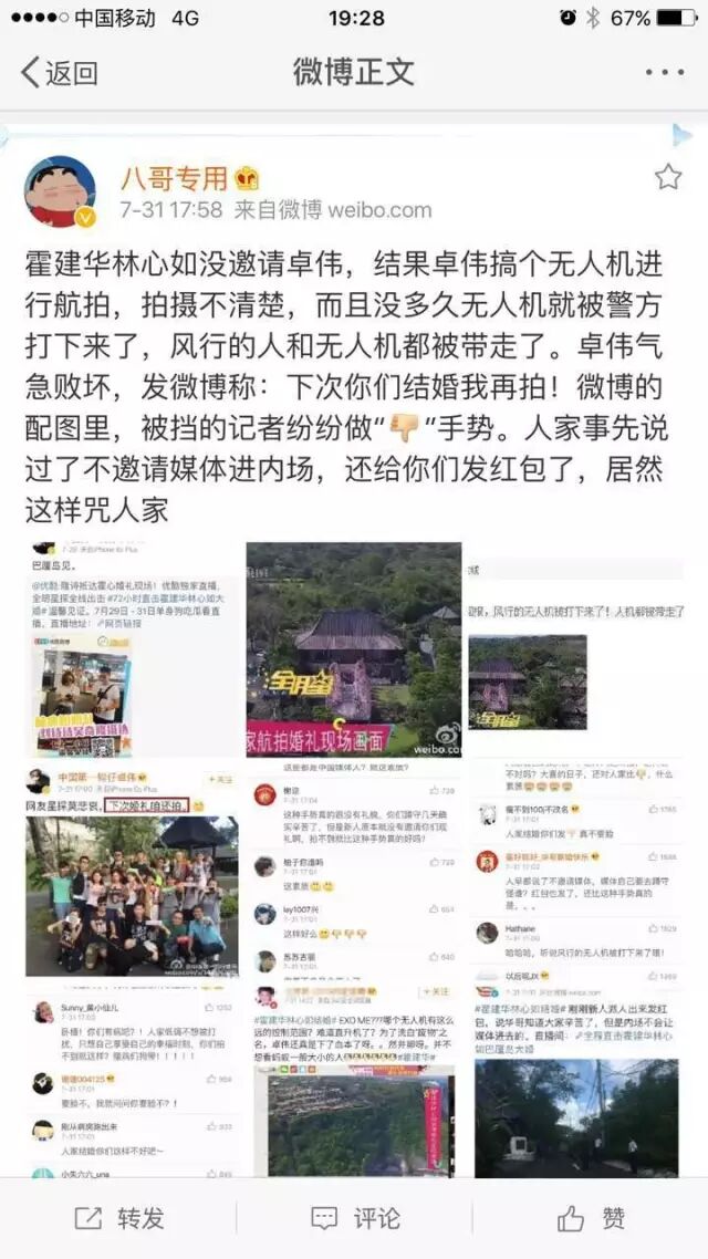 霍建华林心如没邀请卓伟,结果卓伟搞个无人机进行航拍,拍摄不清楚,而且没多久无人机就被警方打下来了,风行的人和无人机都被带走了。