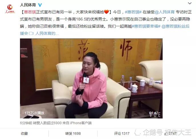 惠若琪公布恋情的消息很快就登上了热搜第一,不过惠若琪只透露了男友的身高,还有就是职业是军医,并没有照片,这也勾起了很多网友的好奇心,不过没过多久,前U体育总编辑就晒出了惠若琪和男友的同框亲密照。