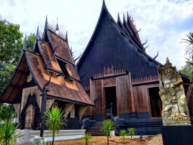 上午参观另外一座神庙【黑庙】,是由泰国鬼才艺术家Thawan Duchanee花费了36年时间设计并建造, 黑庙与白庙截然不同,展现了天堂与地狱,好与坏之间的天壤之别。黑庙周围散落着十几栋大小不一以牛角装饰的建筑,有几栋建筑甚至有三、四层楼高,因为所有的建筑、展品、艺术品等都以黑色为基调,所以又被称之为黑屋,黑屋博物馆。
