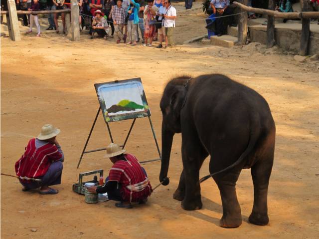 之后乘车前往【大象训练营】,在北部原始森林中,在此参观工作人员训练大小象的工作情形,并观看他们所安排的精彩的【大象表演】,这里的可爱大象会自由随性挥瀷表演独创的绘画天份。