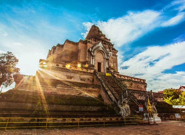 【大佛塔寺】又名“柴迪隆寺”,位于清迈古城的中央,曾经是泰北最高的建筑,因经历了大地震、泰缅战争炮击及雷击后大约剩下60米高,有“亚洲金字塔”的美称。