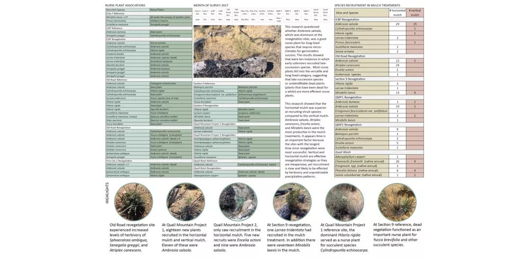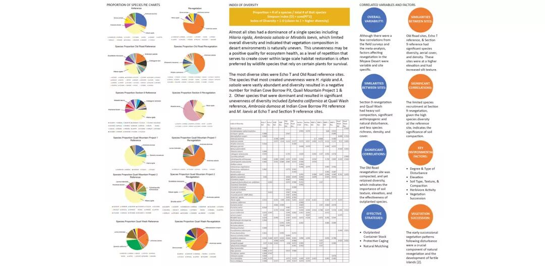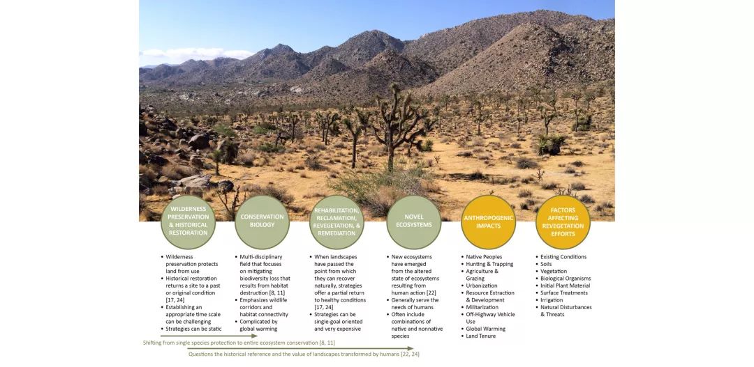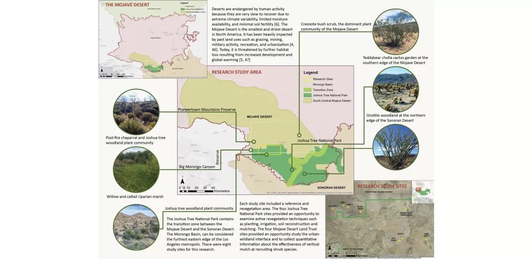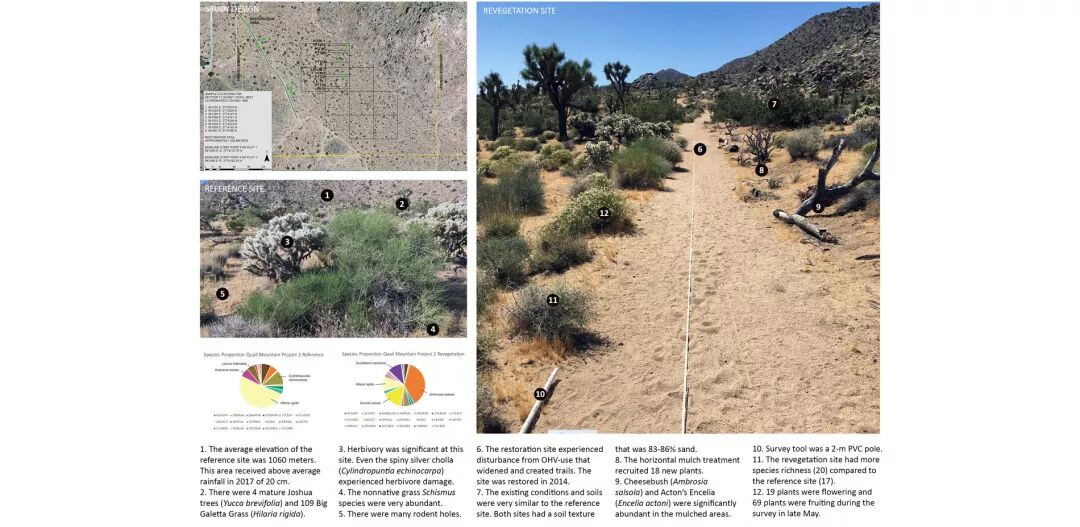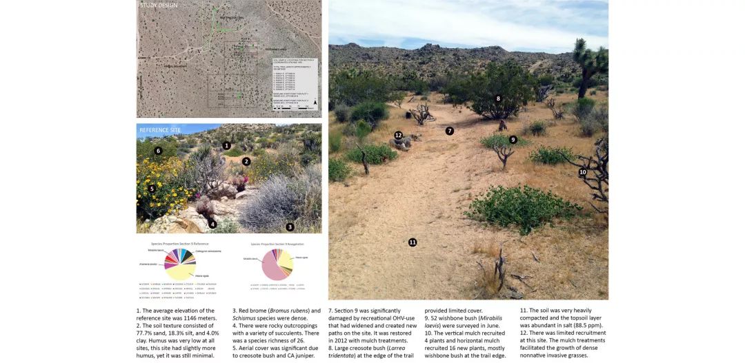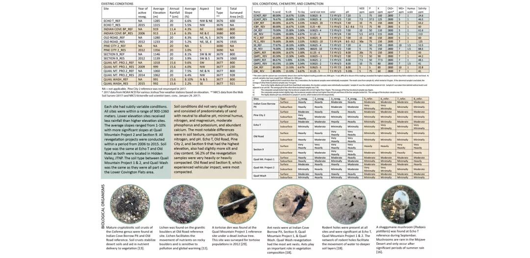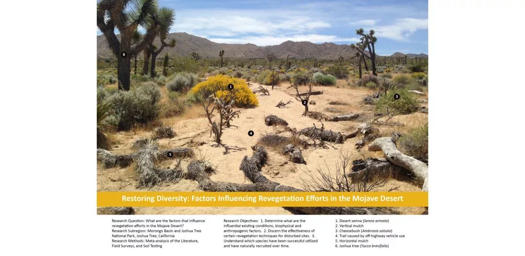 The Morongo Basin and Joshua Tree National Park was especially limited in published research. It is currently experiencing an increase in negative environmental impacts attributed to increased urban development, recreation, and global warming. This study shows that revegetation is possible, yet factors and strategies are variable and site-specific. The results and analysis are valuable for landscape architects practicing adjacent to the urban-wildland interface in arid environments. In addition, this research suggests the importance of understanding soils and the vegetation successional patterns and the need for increased monitoring of restoration efforts in arid regions.
