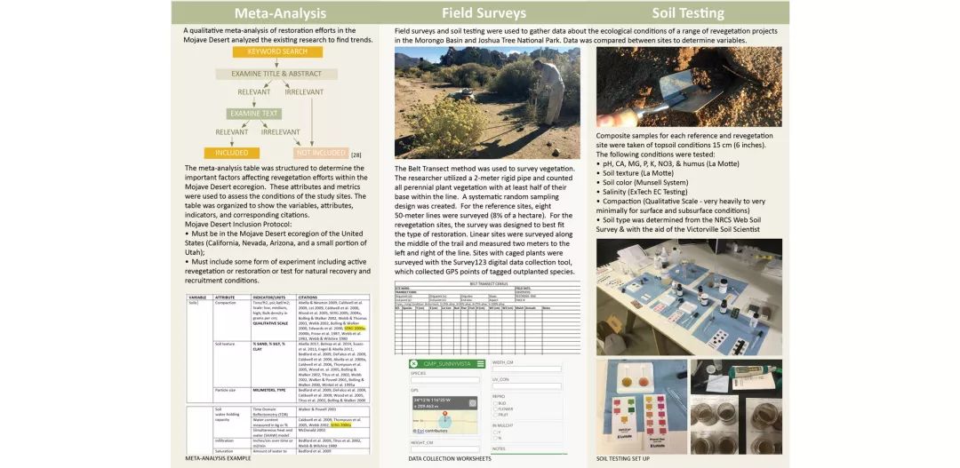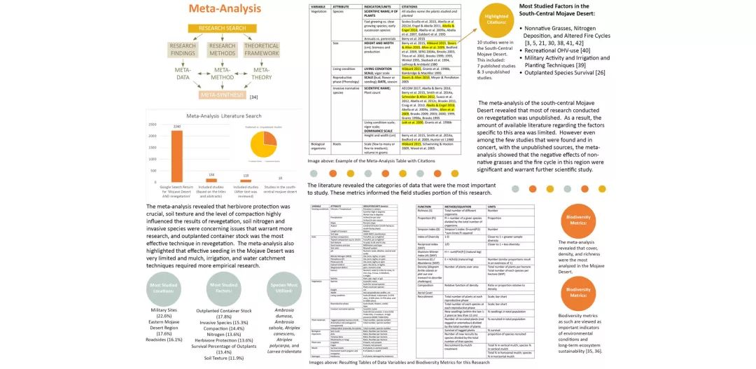 This research examined the capacity for restoration projects to ameliorate disturbed sites in the desert in the context of unprecedented biodiversity loss and potential extinction of species. The study investigated what factors influence revegetation efforts in the Mojave Desert through meta-analysis and field surveys. The goals were to determine influential existing conditions, biophysical, and anthropogenic factors, assess the effectiveness of revegetation techniques, and comprehend vegetation succession following the revegetation of disturbed arid sites.