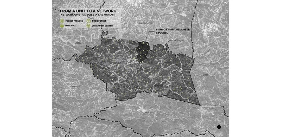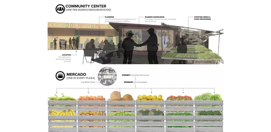 Puerto Rico imports eighty-five percent of its food and the agricultural industry was decimated by hurricane Maria. "El Retorno a la tierra" empowers communities to produce their own food and be self-sufficient. This project presents strategies that could be implemented within the landscape in a barrio for the community to produce their own food. It uses the basic unit of the barrio as a model that could be expanded to other areas. It finds opportunities in the current condition of the forests in the aftermath of hurricane Maria and proposes an integration of food crops with the reforestation efforts in the forests edges, pastures and grasslands. In the 1930's Puerto Rico had an agricultural economy and most of its land was dedicated to agriculture, but this "Retorno a la tierra" is different because it focuses on the diversity and ecological basis of subsistence agriculture, rather than export agriculture that was primary dominated by monoculture. This proposal establishes a new community-based agroecology that creates the possibilities for bringing people back to the land.