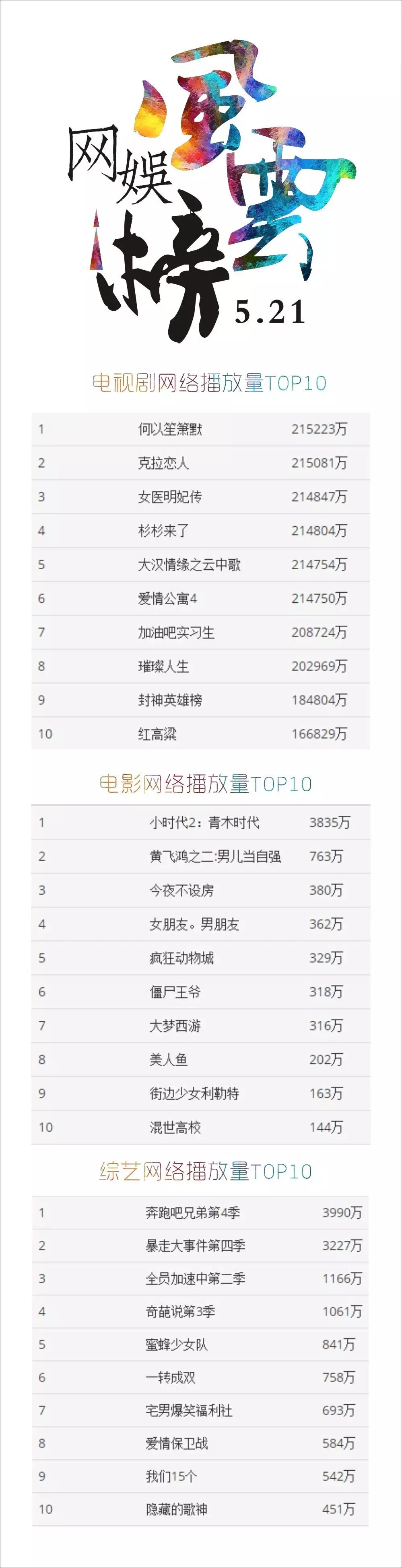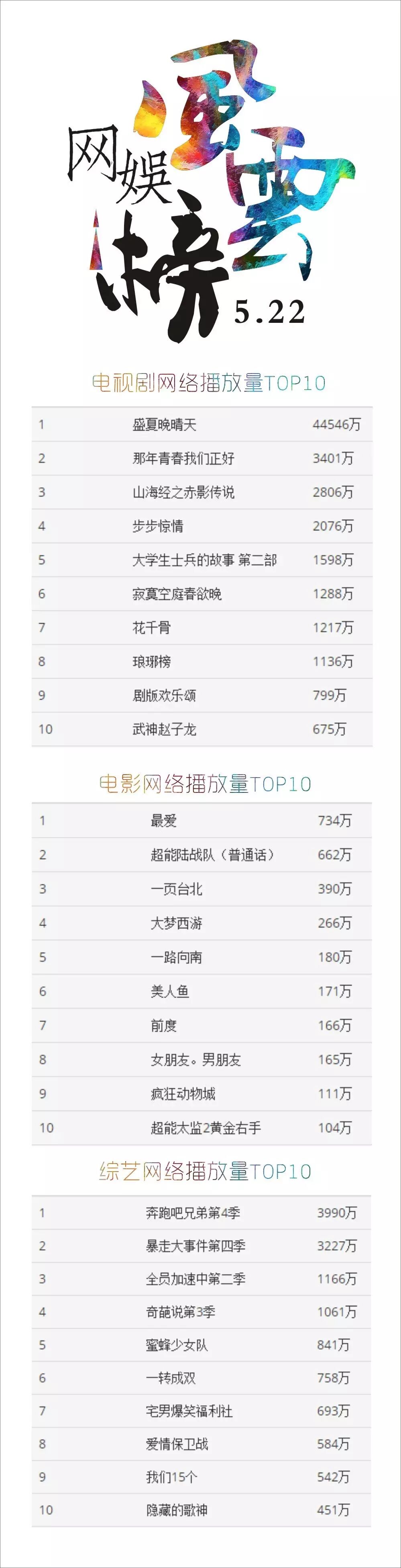 5月16日到5月22日,电视剧、电影和综艺的网络播放量排行中都没有出现什么黑马或特别大的亮点,排行基本延续上周的状况。