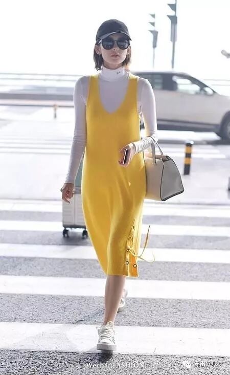 古力娜扎身穿Neil Barrett黄色连身裙,内搭Calvin Klein高领打底衫,脚踩Puma小白鞋,手拎Valextra 2017秋冬系列Passepartout魔方包,完美示范简单明亮的机场look。