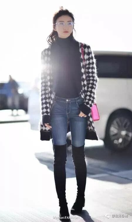 乔欣这身高领露腹毛衣+紧身牛仔裤的搭配,造型随性但是不随意,比较扬长避短。