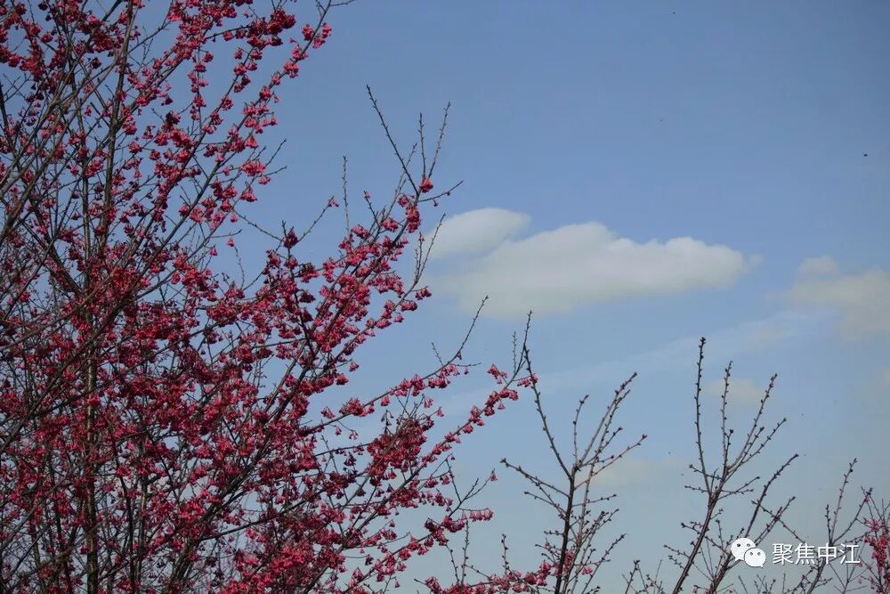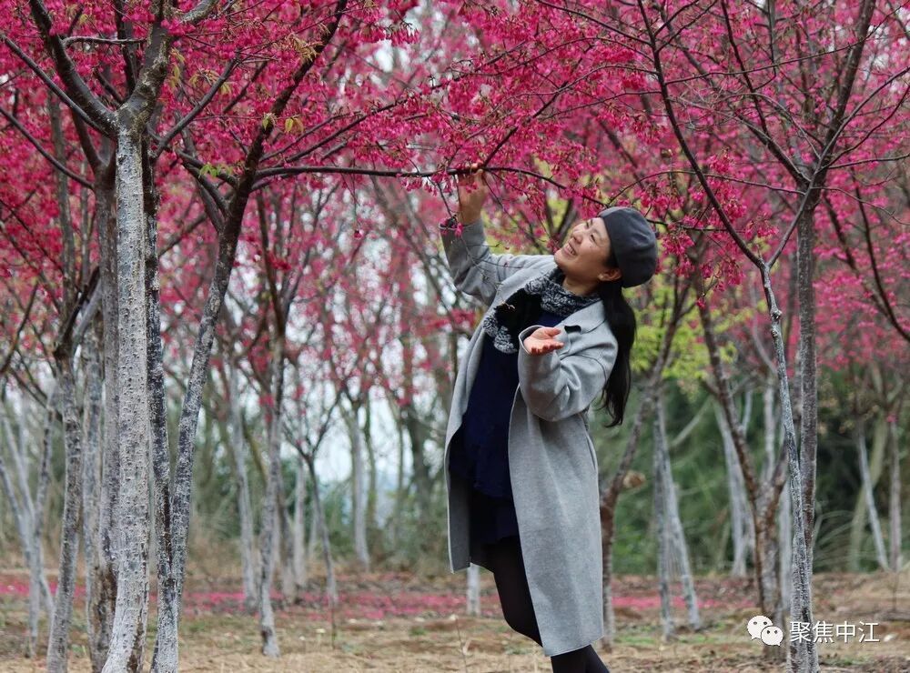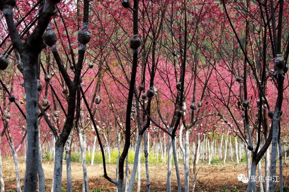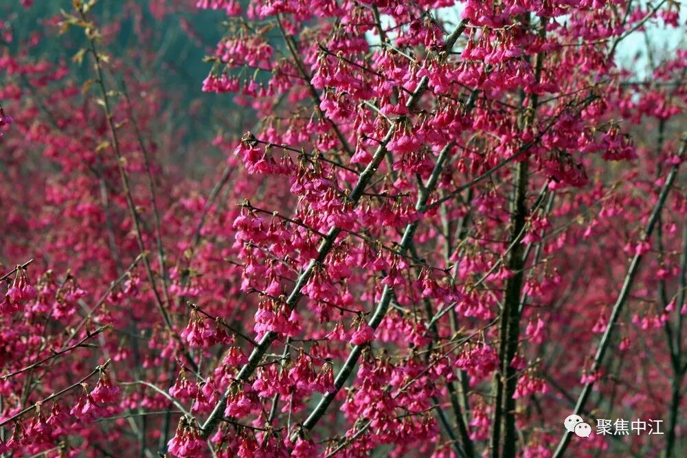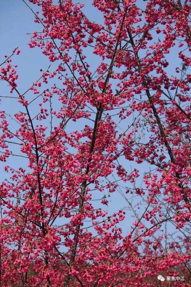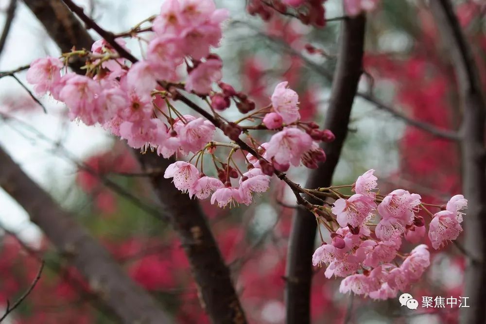 樱花岭的寒绯樱色彩红艳喜庆,盛开在春节前后,花期1-4月,有八重樱、吉野樱、晚樱等多个品种,原产于中国台湾。