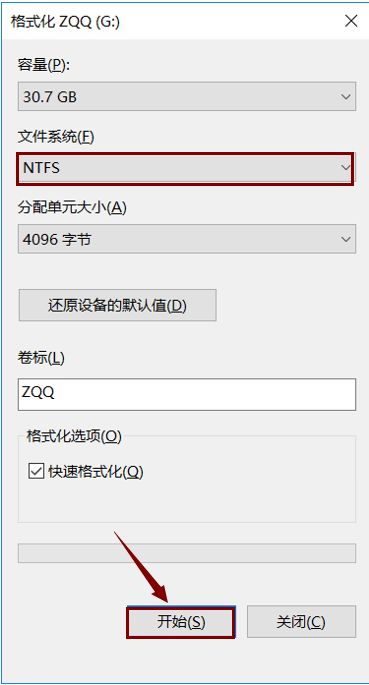 2. 鼠标右击插入的U盘,选择“格式化”,在“文件系统”处选择“NTFS”,点击“开始”。