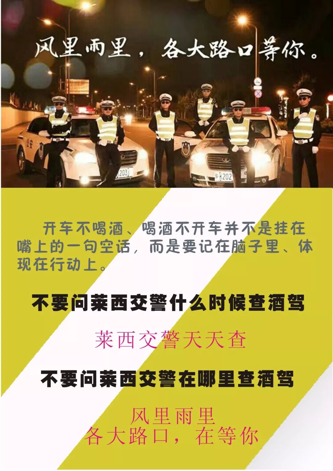 莱西交警温馨提醒广大驾驶人,驾驶车辆一定要遵守交通法规,坚决杜绝酒驾、醉驾等严重交通违法行为,切莫因一时侥幸而造成终身遗憾。开车莫喝酒,喝酒莫开车,莱西交警处处等着您!