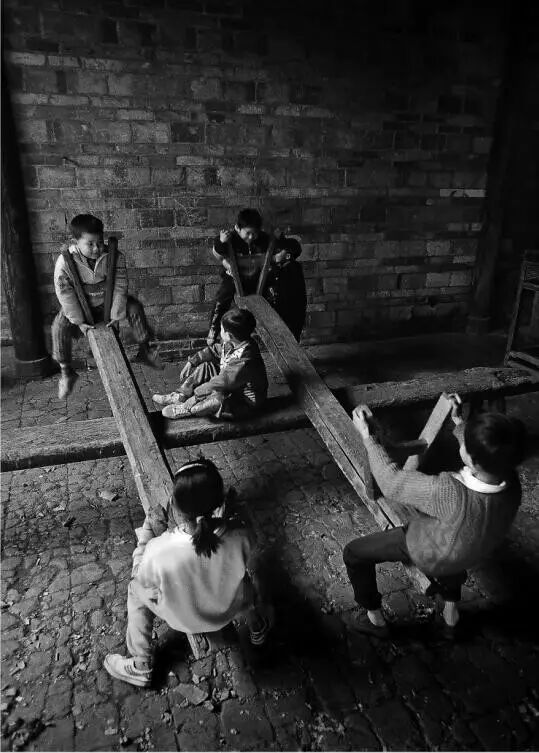赣南乡村儿童用因地制宜的玩耍方式。1995年拍摄于龙南县东昇围