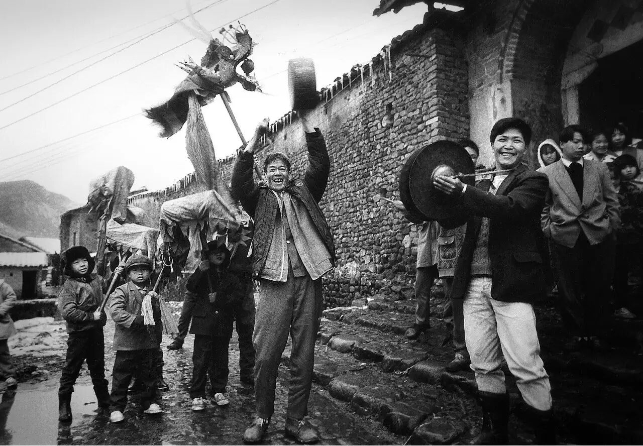 春节舞龙灯是赣南客家乡村最为吉祥的民俗活动,各家喜迎祥龙。1995年拍摄于龙南县杨村