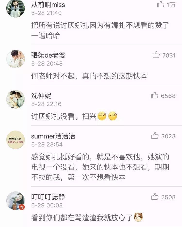 剧组上快乐大本营宣传,何炅刚在自己的微博里发预告,底下的热门评论一溜儿都是说不喜欢娜扎的。