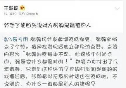并且张翰在和郑爽分手之后,还被发现他在“他和郑爽很不配”的微博点了赞,连王思聪都看不下去了。