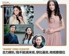 其次,从出道开始就是标榜清纯古力娜扎曾接受采访时说,不演床戏,不穿比基尼,吻戏要借位。