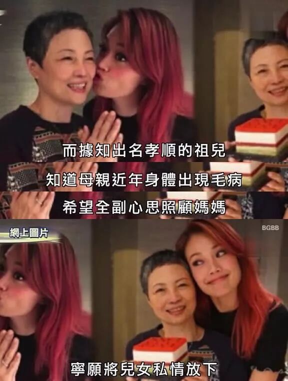 容祖儿是有名的孝顺女儿,四年前,她的妈妈患上了肺癌,她即推掉所有的工作,专心照顾母亲,还花费过百万港元,从美国邀请癌症专家到香港给妈妈治病。