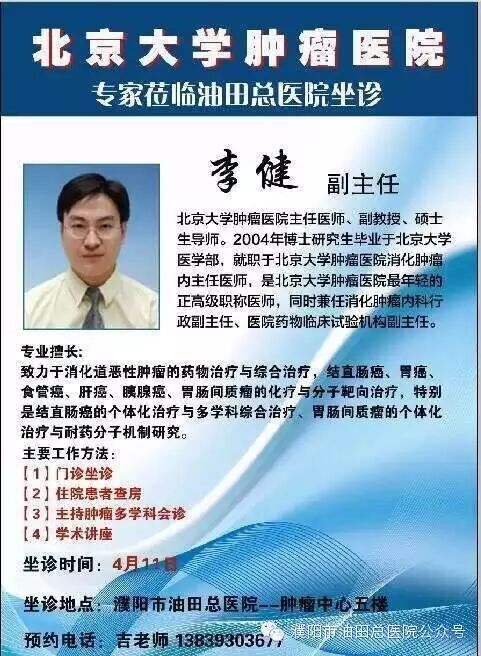 李健博士这次到我院将开展肿瘤中心开展业务大查房、出专家门诊、参加全院肿瘤疑难病例多学科会诊等。