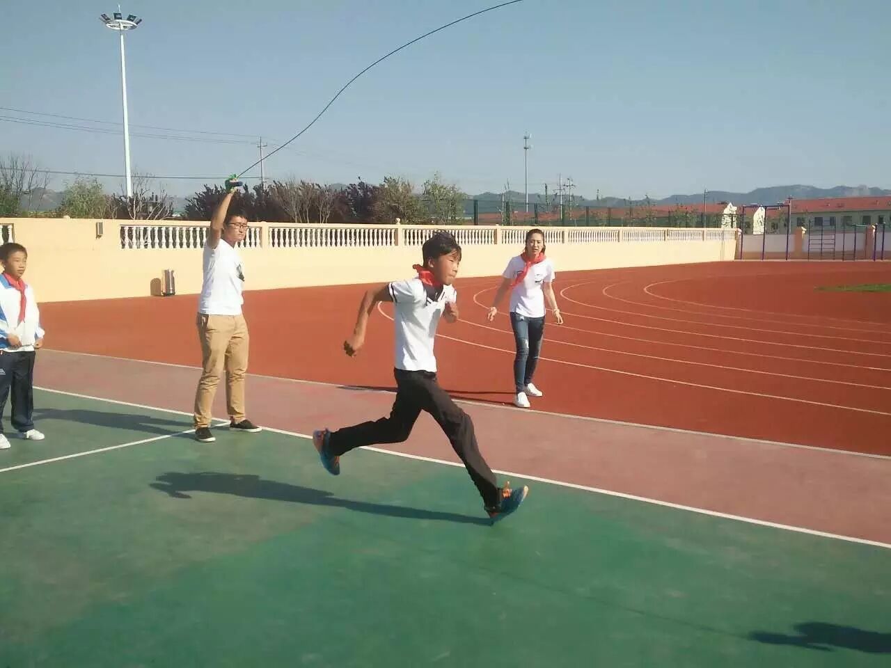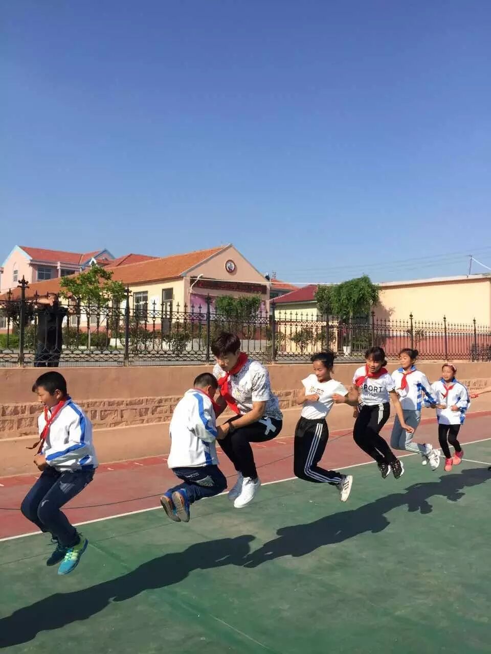 随后,张亮、刘烨与同学们来到操场进行室外活动,分别带领两队同学开始了跳绳比赛。