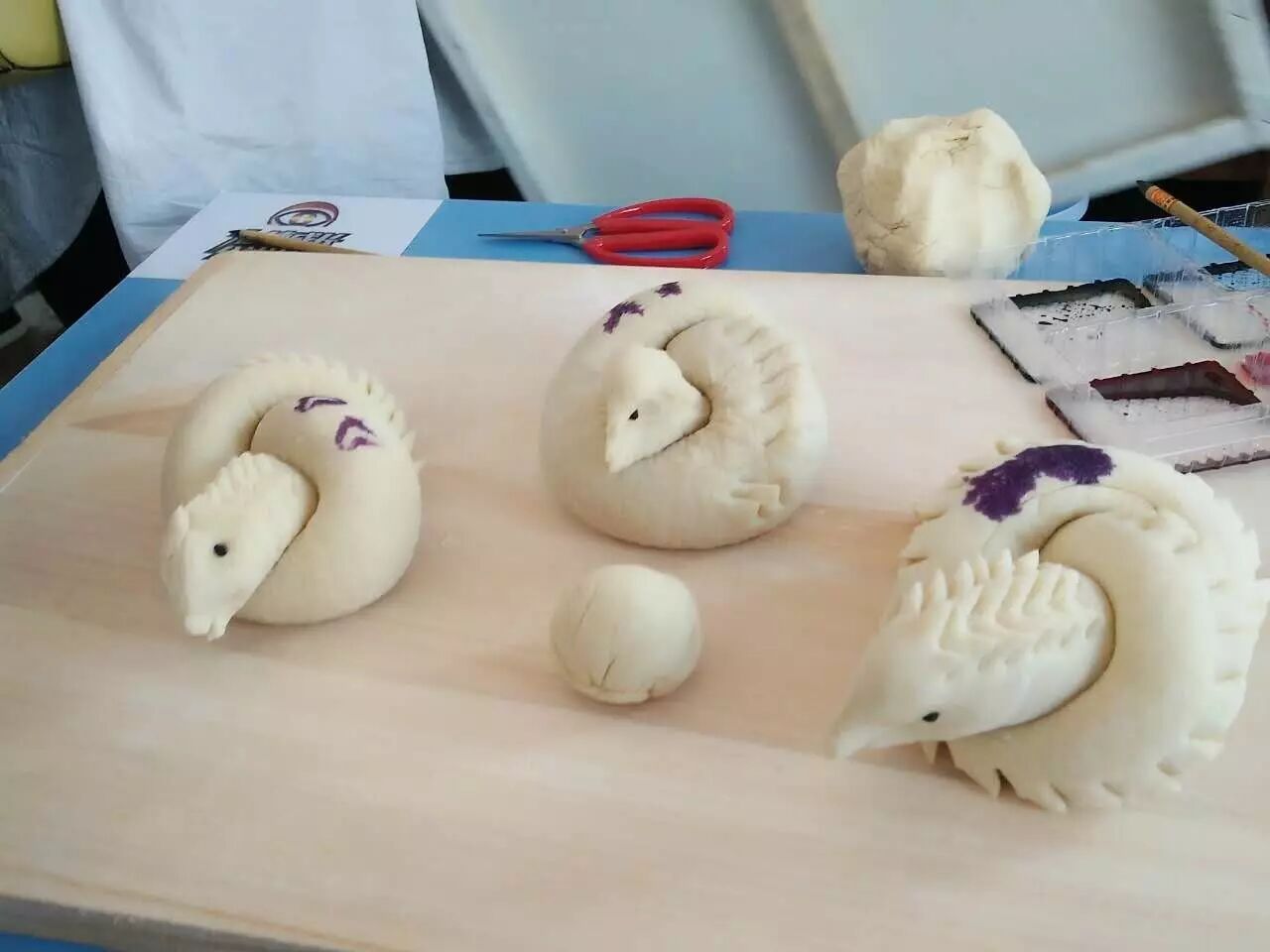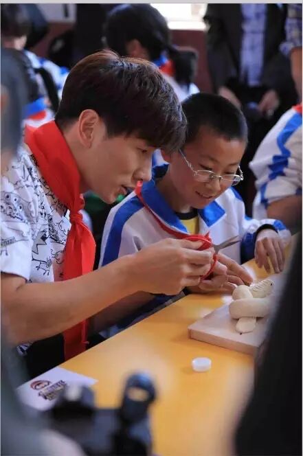 读书环节结束后,张亮、刘烨还和各位同学一起体验制作胶州大饽饽。揉面、塑形、点缀,个个都玩得不亦乐乎,料理经验丰富的张亮在面点师傅的简单指导后便快速上手,不一会儿便把一只可爱的小刺猬制作了出来,另一边的刘烨则要制作一系列“神虫”家族,由于鲜少接触面食制作,刘烨在“神虫”的塑形上可是费了不少功夫,最终,在小朋友的帮助下,“神虫”也成功完成,涂绘上了颜色。
