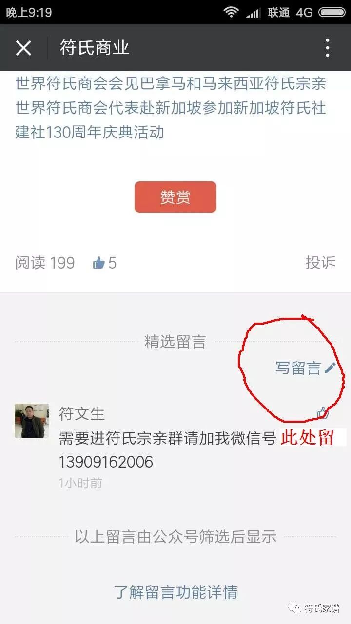 友情提示:最近发现很多符氏宗亲把在公众号底部留言当做文章底部留言,其实文章底部留言,一般只有管理员才能看到,无法显示出来,大家看到,如果想要大家都看到,需要在文章的底部留言,如下提示。