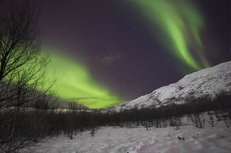 绿色的,如雾气一般,在星空中慢慢汇聚,汇聚,不知不觉间已成为一条巨大的绿色光带,缓缓的舞动变换着,从边缘处再慢慢变成紫色,红色,闪烁出漫天的火焰,很难有人见到这样的场景而不感动于造物主的神奇。彼时恰有流星雨大爆发,我把相机架在雪地里,与伙伴一起躺在地上观看世界上最纯净的夜空。雪山,星空,大海,时而有流星陨落,这就是一直在我的想象室内被保护着的美妙极光,和谐无比的想象与现实。