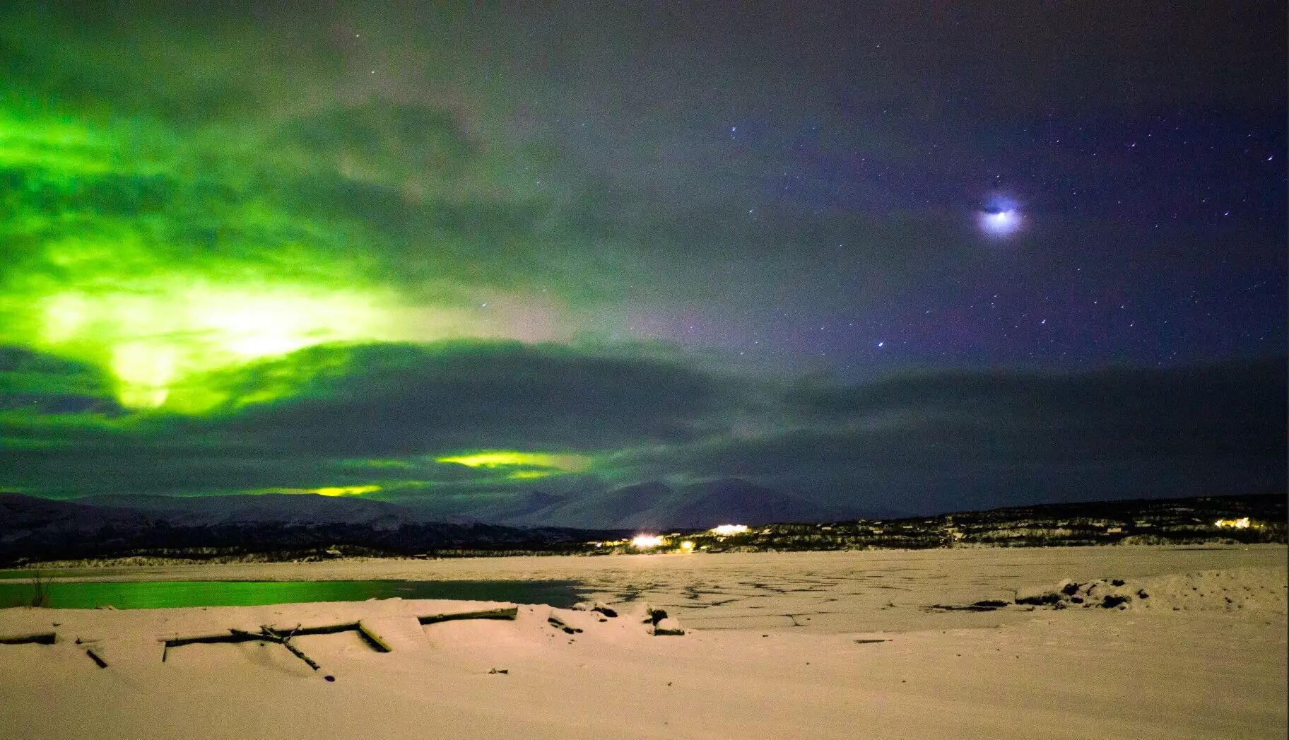 瑞典的阿比斯库,强烈的极光在云层中难以隐藏,染绿了冰层碎裂的整个湖面。星辰在如雾如烟的极光下散发出诡异的光芒,远处的雪山平缓而有序得排列,仿佛是达利的超现实主义画作,使人如处梦境。