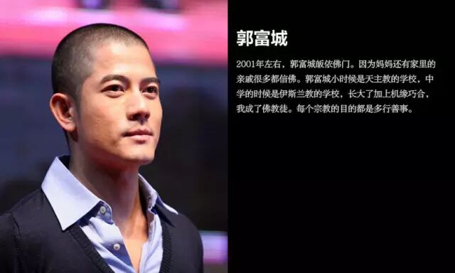 2001年左右,郭富城皈依佛门。因为妈妈还有家里的亲戚很多都信佛。郭富城小时候是天主教的学校,中学的时候是伊斯兰教的学校,长大了加上机缘巧合,成了佛教徒。每个宗教的目的都是多行善事。