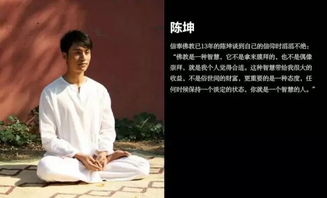 信奉佛教已13年的陈坤谈到自己的信仰时滔滔不绝:“佛教是一种智慧,它不是拿来膜拜的,也不是偶像崇拜,就是我个人觉得合适。这种智慧带给我很大的收益,不是俗世间的财富,更重要的是一种态度,任何时候保持一个淡定的状态,你就是一个智慧的”。