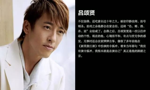 吕颂贤不仅信佛,还吃素长达十年之久。拍戏之余他都会在家念经,还将“色、赌、酒、杀、盗”全给戒了。念佛之后,吕颂贤更是一改以往冲动的个性,现在的他,心境很平和,有点与世无争的感觉”。