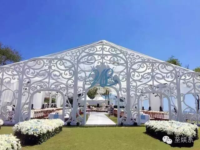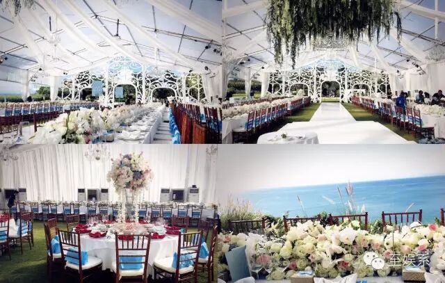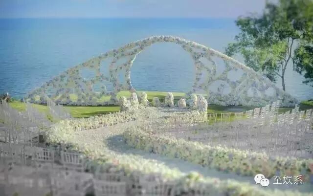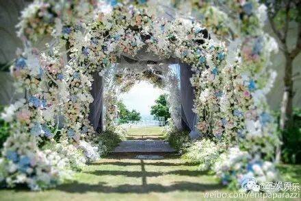 婚礼现场被从厄瓜多尔和荷兰运来的粉白鲜花堆砌成如梦似幻的花海。