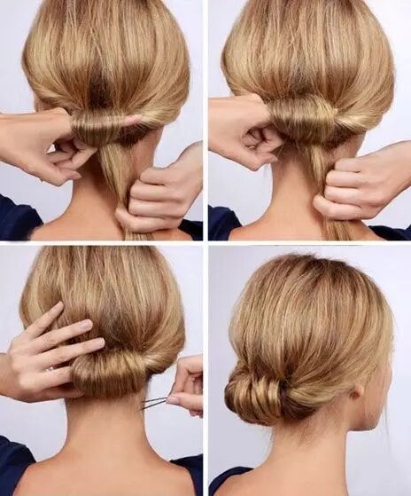这款同样是先扎一个马尾,然后把头发反向插进头发中间,在连续卷几圈,最后固定就好了。比较适合头发长得姑娘们,如果是lob之类的就不太适合。