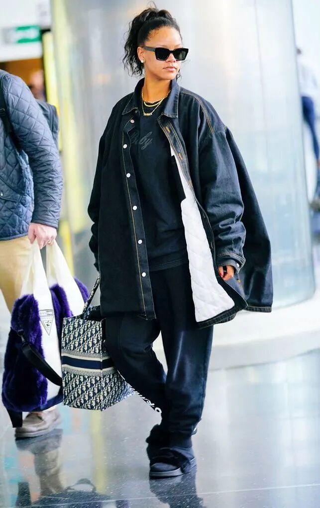 说到中性,不得不提RiRi的oversize外套穿搭,从牛仔衬衫式夹棉外套到飞行员夹克,RiRi驾驭得稳稳当当:拖地阔腿裤与衬衫式外套在廓形上是很好的搭档;阔腿牛仔裤与飞行员夹克的组合看似毫无亮点,头巾成了提升造型时髦度的关键单品;格纹oversize外套与运动裤一起展现出休闲风。