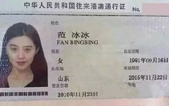 范冰冰的证件照。