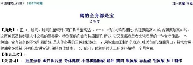1、1987年《四川农业科技》杂志发表了一篇邓祖信写的文章《鹅的全身都是宝》。说:鹅的肉、油、肝、胆、毛、蛋都是宝,合成标题鹅的全身都是宝。我想哥哥因为这样喜欢鹅,未免太LOW了。