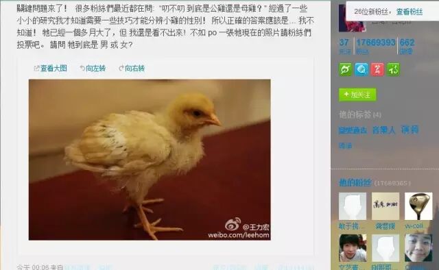 王力宏的宠物是一只“小鸡鸡”。男神曾经居然在微博里晒出自己养的“小鸡鸡”——“叨不叨”(鸡不醉人名自醉),宣称这就是他的宠物,还研究如何分辨小鸡性别!(研究个咩啊,问问云迪就好了。)