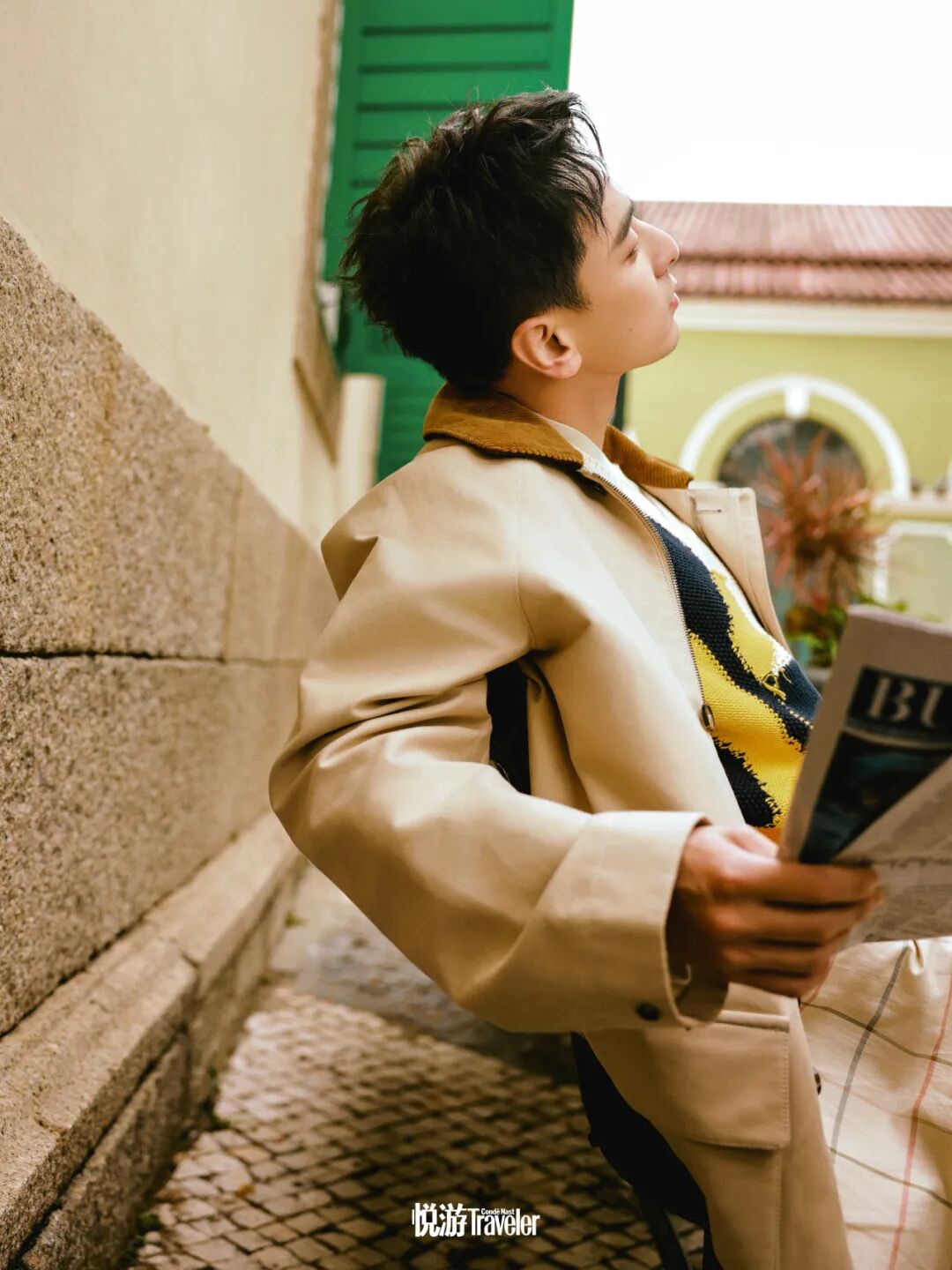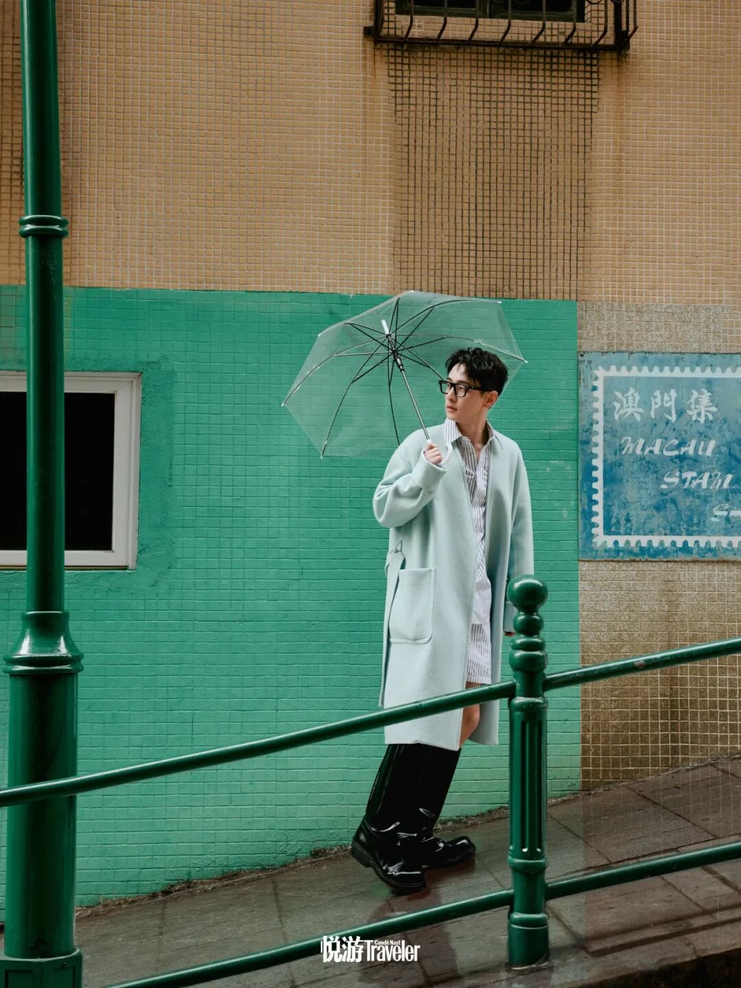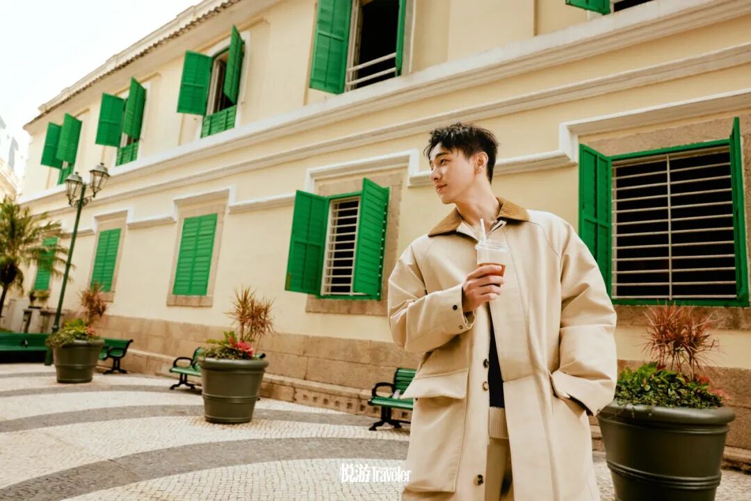 聊着天,任彬又吃了一口用来当道具的蛋挞,好像忘记了这里是拍摄现场。我们从岗顶前地出发,一路穿过望德堂区的历史建筑区域和疯堂斜巷,沿途是成片的葡式建筑,如今它们已经各自有了新的用途,是咖啡店,是创意店铺,是特色餐厅,老街的滋味越品越不同,像人一样。但无论进入哪座建筑,任彬总能立即找到自己的角色,而后与这里的环境融为一体。从他面对镜头,自在地随口吃下PASTEIS DE CHAVES里的葡式蛋挞的那一刻起,他已找到了自己的“真”,那便是“红尘滚滚多颜色,我自随遇而安”。