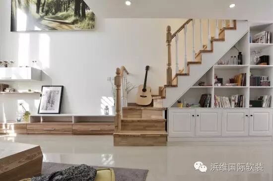 楼梯采用了实木设计,没有多余的装饰,现代简约的家装风格除了营造出质朴的温暖空间外,也藉由木质表面更接近自然的触感。