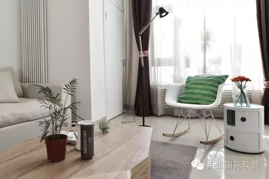 客厅近邻床边,不仅使光线十足,也让空间感更为宽敞。以白色为主的客厅,搭配原木书桌椅,加上沙发上的那一点黄色抱枕有了画龙点睛的效果,为空间营造出生机活泼感。墙上的壁画,和各种装饰以及设计独特的灯泡增添了艺术效果。