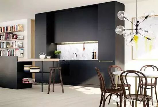 厨房设施现代化,黑色的厨具带来一丝沉稳感。大理石面的餐桌配上桃木餐椅,优雅大气,天花板上的吊灯未来感十足。