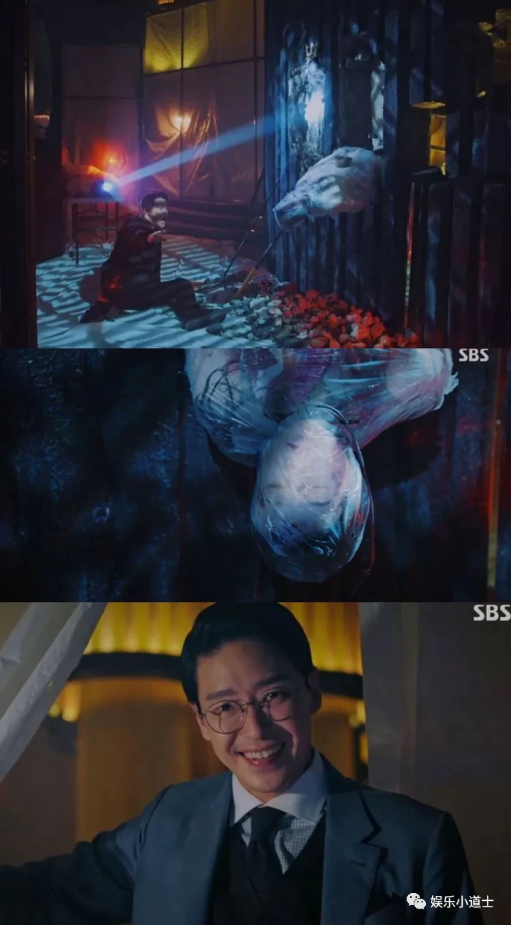 朴浩山(上图左)在赫拉皇宫喷水池找到的遗体竟是柳真,严基俊(下图)窃笑埋伏笔。翻摄SBS