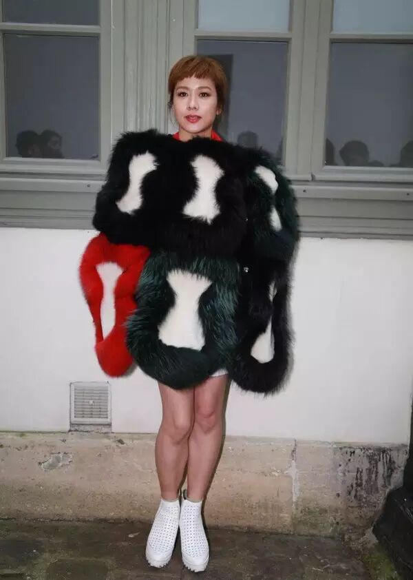 再看林嘉欣亮相今年巴黎时装周哦,到底是什么鬼,皮草做的马赛克吗?